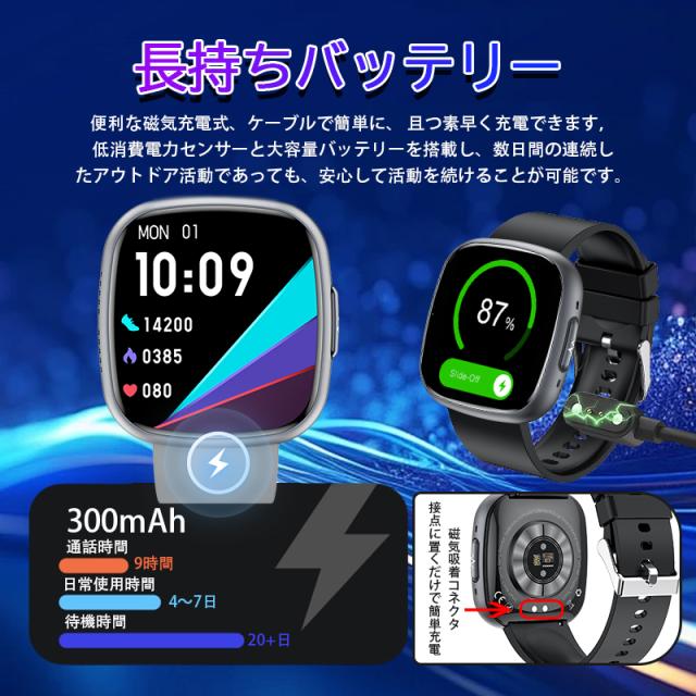 バイブで大事なメッセージを見逃さない。携帯を出さずにメッセージ、電話、SMS通知、Line、Facebook、Twitterなどの通知がバイブでお知らせ、お手元で内容が確認することができます。また、スマートウオッチでスマホの音楽の再生/一時停止/前の曲/次の曲/音量のコントロールできます。300mAhのバッテリーが内蔵、約2時間充電し、一度のフル充電で5~7日間の連続使用が可能。頻繁に充電する手間が省けます。