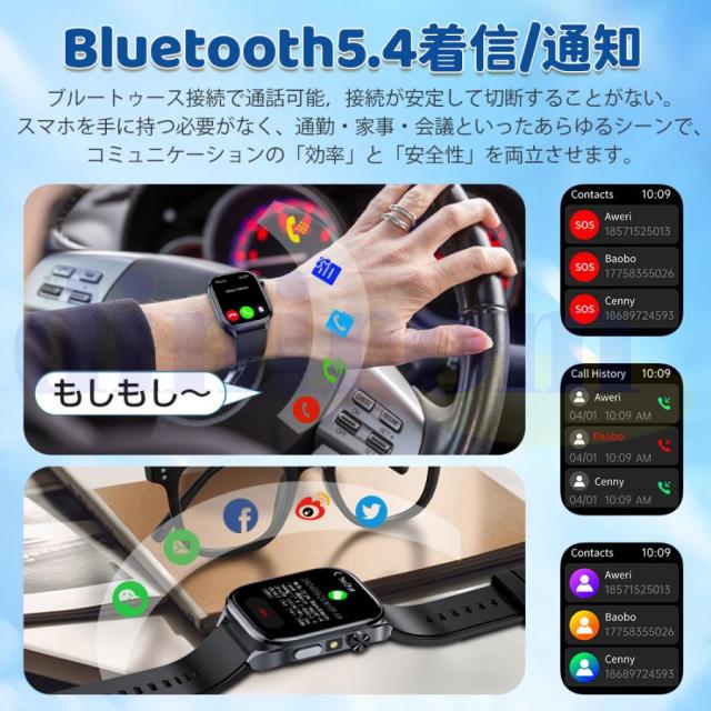 このスマートウォッチはBluetooth5.4を採用され、より高速、より安定した接続を実現します。スピーカー&高性能マイクが内蔵され、携帯電話を出さなくても、通話することができます。着信に応答または拒否することができます。更に電話をかけたり、通話履歴を表示したりすることができます。電話帳をあらかじめアプリ側に追加すれば、スマートウォッチ側の連絡先で表示できます。専用アプリ「G Band」の通知設定をONにすると、LINE、Twitter(X)、Facebookなどの通知は、スマートウォッチ振動でお知らせします。
