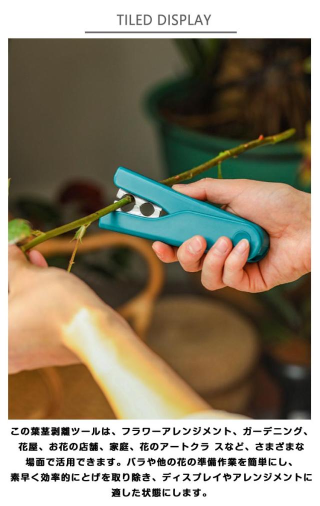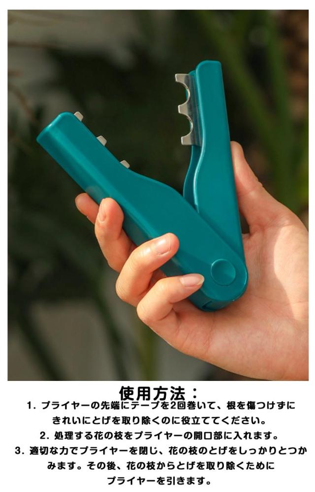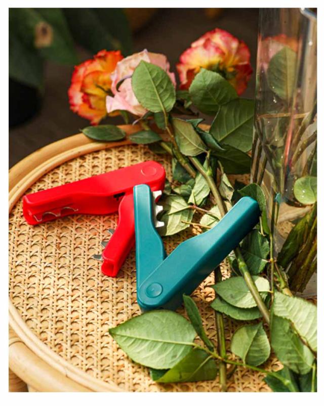 | この葉茎剥離ツールは、フラワーアレンジメント、ガーデニング、花屋、お花の店舗、家庭、花のアートクラ スなど、さまざまな場面で活用できます。バラや他の花の準備作業を簡単にし、素早く効率的にとげを取り除き、ディスプレイやアレンジメントに適した状態にします。 使用方法: 1. プライヤーの先端にテープを2回巻いて、根を傷つけずにきれいにとげを取り除くのに役立ててください。 2. 処理する花の枝をプライヤーの開口部に入れます。 3. 適切な力でプライヤーを閉じ、花の枝のとげをしっかりとつかみます。その後、花の枝からとげを取り除くためにプライヤーを引きます。 注意:バラのとげ取りツールを使用する際は、注意して取り扱ってください。けがをしないようにしてください。 | |