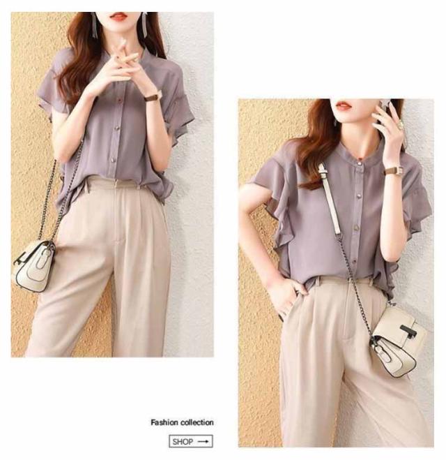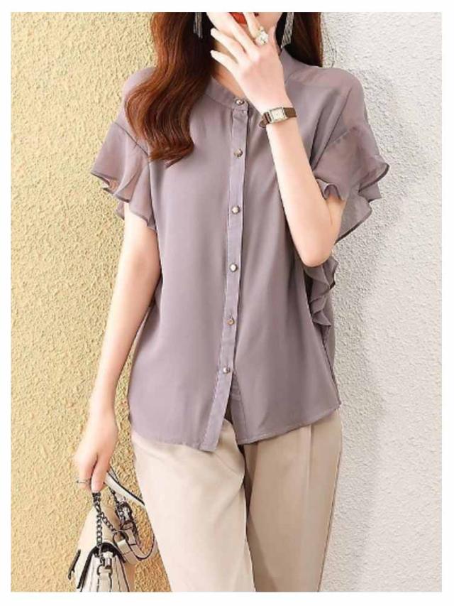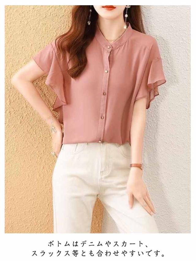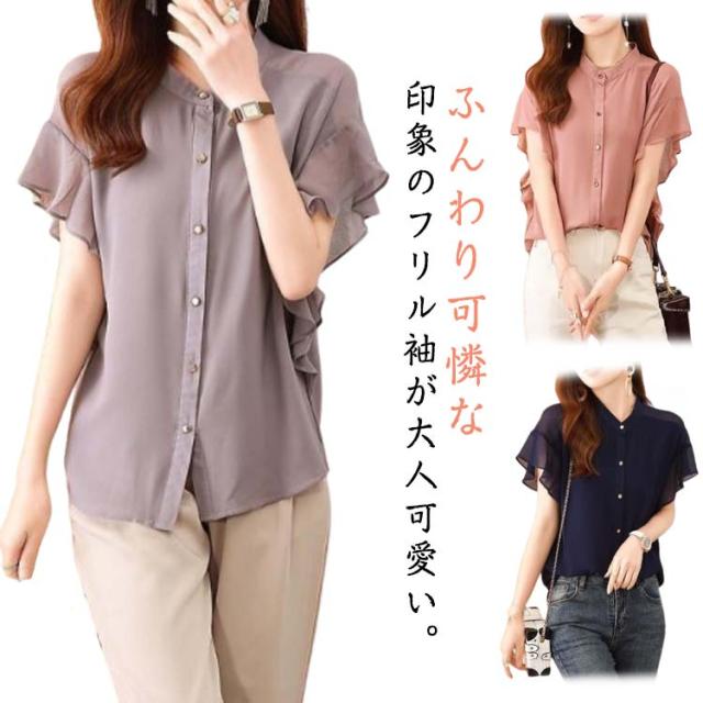 フレアスリーブ 半袖ブラウス レディース カジュアル トップス 春夏 無地 フレア袖 ブラウス 前開きシャツ シャツ 薄手 フォーマル フリル ブラウス 夏コーデ オフィス きれいめ 通勤 OL 結婚式 パーティー 二次会 大人女性 大きいサイズ ノーカラー