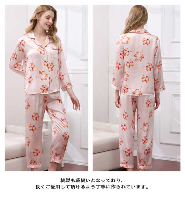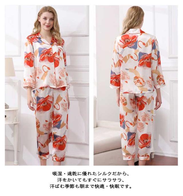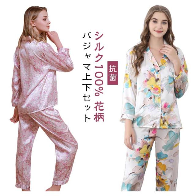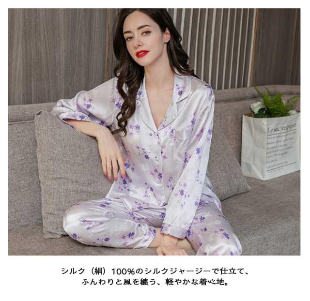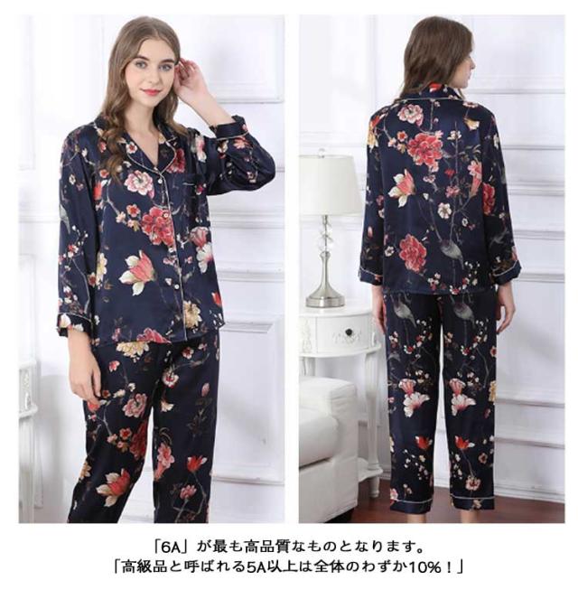 | シルク100% 花柄 パジャマ上下セット 美しい落ち感のある生地で、しっとり健やか&天然シルク100%☆ 滑らかな肌触りで、お肌にも心地よいやさしいシルク パジャマに仕上がりました。 身体にやさしく、美しいシルク。夏涼しく、冬は暖かさを逃げしません。 シルク(絹)100%のシルクジャージーで仕立て、ふんわりと風を纏う、軽やかな着心地。 大人華やかな花柄&高品質なボダン付き、おしゃれを楽しみながら便利なデザインです。 昼間も使えるシャツデザインなら、おしゃれを楽しみながら肌を乾燥から守れます。 丁寧な縫目は均一でスムーズです。贅沢な光沢があるシルク素材で、シンプルで上品なパジャマです。 「6A」が最も高品質なものとなります。「高級品と呼ばれる5A以上は全体のわずか10%!」 シルクの中でも軽量な16.5匁シルクを使用。 重みを感じることがなく、ふわっとした軽さで肩こりの心配もありません。 シルクは美しいだけではなく、生物の蚕から生まれたシルクの成分は蛋白質。 この蛋白質は人間に必要な18種類ものアミノ酸を含んでおります。 このアミノ酸が「血管の硬化を和らげ、若さを保つ効果がある」と言われています。 また、シルクは綿の1.5倍という優れた吸湿性を持っているため、 蒸れることなく、お肌をサラサラの清潔な状態に保ちます。 身につけることで素肌の乾燥を防ぎ、しっとりスベスベの肌へと導きます。 人間の皮膚に最も近い天然繊維のため、お肌が弱い方や化学繊維などでかぶれてしまう方にも安心してお使いいただけます。 吸湿・速乾に優れたシルクだから、汗をかいてもすぐにサラサラ、汗ばむ季節も朝まで快適・快眠です。 体系をさりげなくカバーしてくれるゆったりシルエットでとっても楽ちん。 縫製も袋縫いとなっており、長くご愛用して頂けるよう丁寧に作られています。 パジャマやルームウエアとして...ずっと身に着けていたくなる、大人も満足の一枚です。 季節を問わず、年中快適にご使用いただけます。 お友達やご家族へのプレゼントにもぴったり! | |