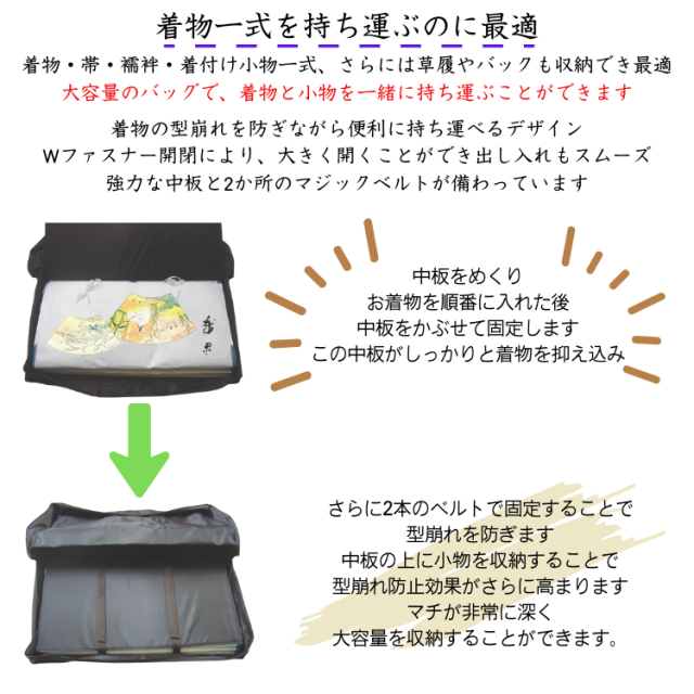 大容量のバッグで、着物と小物を一緒に持ち運ぶことができます
