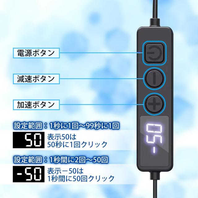 ・この自動タップ機は、1秒に2回〜最大50回までのクリックと1秒に1回から?最大99秒に1回までのタップ速度を設定でき、ランダムモードと合わせて全117段階のクリック周波数レンジを設定できます。