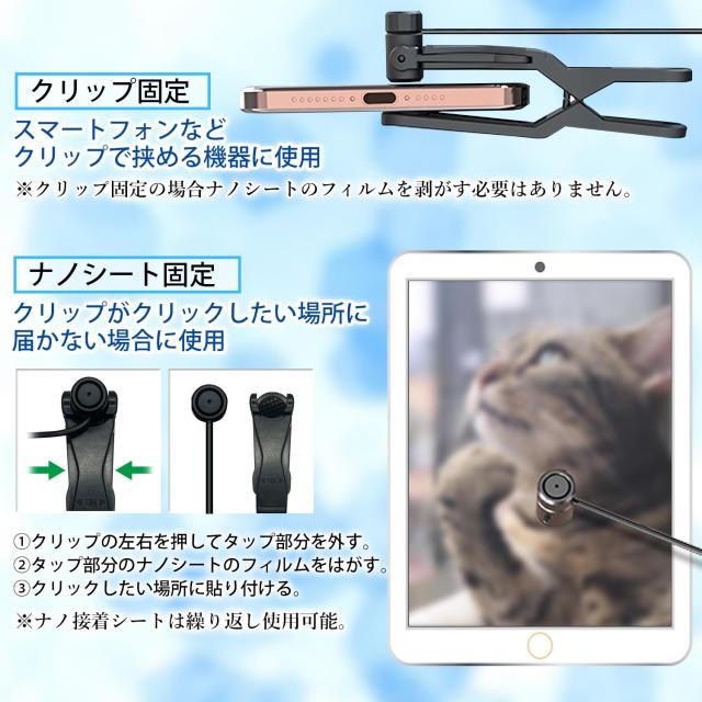 ・ クリップ固定:スマホなどクリップで挟める機器は、クリップ固定して使用(ナノシートのフィルムを剥がす必要はありません)