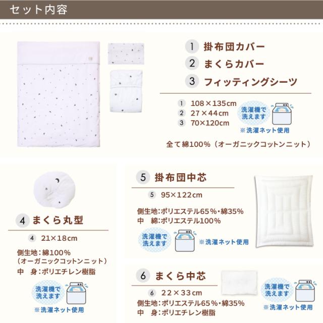 【1】掛布団カバー<108×135cm> ■中国製 綿100%(オーガニックコットンニット) 【2】掛布団中芯<95×122cm> ■中国製 側生地/ポリエステル65%・綿35% 中綿/ポリエステル100% 【3】枕カバー<27×44cm> ■中国製 綿100%(オーガニックコットンニット) 【4】枕中芯<22×33cm> ■中国製 側生地/ポリエステル65%・綿35% 中身/ポリエチレン樹脂 【5】固綿敷布団<70×120cm(厚み約5.5cm)> ■側生地:中国製 中綿:日本製 側生地・中綿/ポリエステル100% 【6】フィッティングシーツ<70×120cm> ■中国製 綿100%(オーガニックコットンニット) 【7】ベビー枕<21×18cm> ■中国製 側生地/綿100%(オーガニックコットンニット) 中身/ポリエチレン樹脂 【8】防水キルトパッド<70×120cm> ■中国製 表側:綿100%(パイル部分)(オーガニックコットンパイル) ポリエステル100%(地糸) 中綿:ポリエステル100% (裏側ポリウレタンラミネート加工) 内寸サイズが長さ120cm×幅70cmのベビーベッドに対応しています。 |