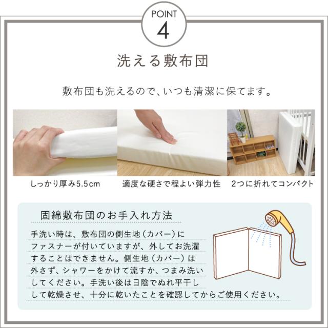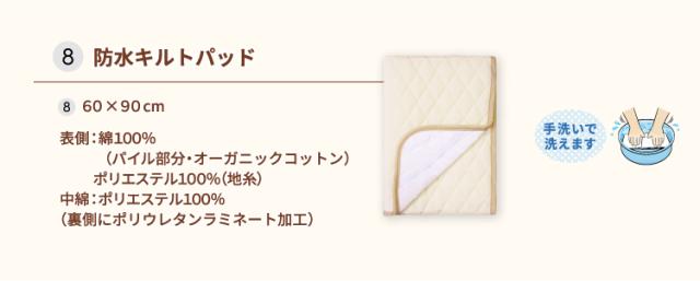 【1】ミニ掛布団カバー<サイズ:80×105cm> ■中国製 綿100%(オーガニックコットンニット) 【2】ミニ掛布団中芯<サイズ:75×100cm> ■中国製 側生地/ポリエステル65%・綿35% 中綿/ポリエステル100% 【3】枕カバー<サイズ:25×42cm> 綿100%(オーガニックコットンニット) ■中国製 【4】枕中芯<サイズ:21×31cm> ■中国製 側生地/ポリエステル65%・綿35% 中綿/ポリエステル100% 【5】ミニ固綿敷布団<サイズ:60×90cm(厚み約5.5cm)> ■側生地:中国製 中綿:日本製 側生地・中綿/ポリエステル100% 【6】ミニフィッティングシーツ<サイズ:60×90cm> ■中国製 綿100%(オーガニックコットンニット) 【7】ベビー枕<21×18cm> ■中国製 側生地/綿100%(オーガニックコットンニット) 中身/ポリエチレン樹脂 【8】ミニ防水キルトパッド<サイズ:60×90cm> ■中国製 表側:綿100%(パイル部分)(オーガニックコットンパイル) ポリエステル100%(地糸) 中綿:ポリエステル100% (裏側ポリウレタンラミネート加工) 内寸サイズが長さ90cm×幅60cmのベビーベッドに対応しています。 |