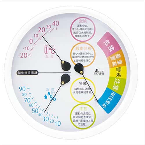 熱中症レベルを5段階で表示します。裏面に壁掛けができるフック穴が付いています。温度・湿度・熱中症注意が同時に確認できます。