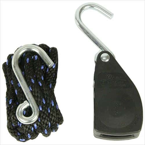 ラチェット機能がついたロープ締機です。引張るだけでしっかり固定できます。緩める時はレバーを押すだけで簡単です。