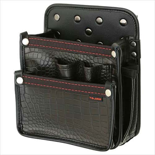 光沢と凹凸が独特の高級感と存在感を放つクロコ調、高強度でしなやかな高耐久素材です。腰周りの組み換えが簡単な着脱式です。ベルトを外さず途中から差せる後付式ホルダー採用です。ペンチ、ニッパー、全ネジ回しや検電器など多彩な工具が収納可能です。ケーブルラックのジョイントなど、かさばる資材も収納できる大口ポケットです。