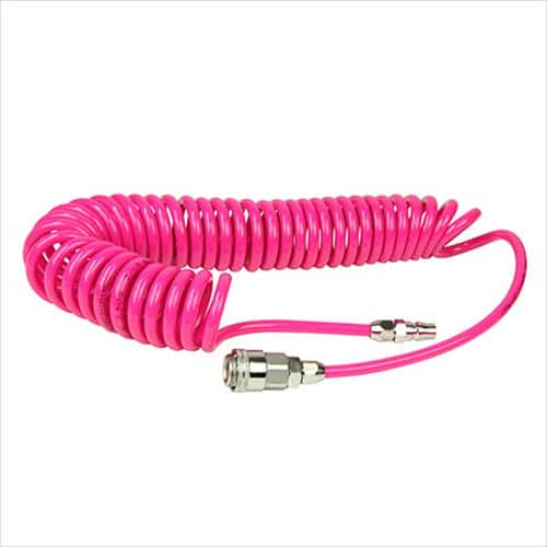 伸ばして作業ができ、縮めて収納できる伸縮で邪魔にならないコイル状のエアホースです。ワンタッチソケット付きで、便利です。