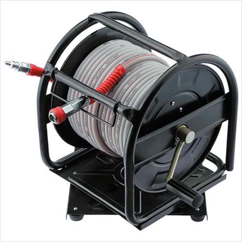 ワンタッチカプラ付高圧用エアーホースリール。