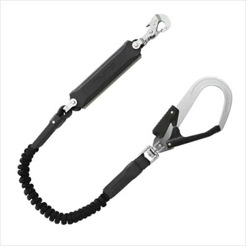 伸縮性のある蛇腹式ロープです。不使用時は短くなるので邪魔になりません。フックは硬質焼入ゲートのスチールフックです。ランヤードの取付け・取り外しが簡単に行える脱着機構を採用、ランヤードが絡まりにくいより戻し機構付きです。ショックアブソーバはエラストマーカバーで被覆したスリムな形状で、作業時にも邪魔になりません。