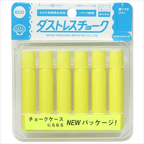 ホタテの貝殻を主原料として使用しているため、粉の飛散が少なくソフトな書き心地です。石膏チョークに比べ2倍以上長く使用でき、経済的です。主原料の炭酸カルシウムは、歯磨き粉にも使われる成分で、体に安心・安全です。手につきにくいコーティング加工で清潔です。粒子が重いため、粉末が飛散せず、着衣や室内を汚しません。