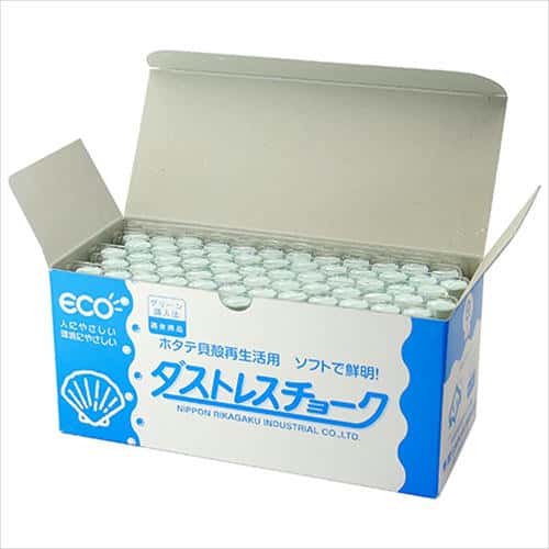ホタテの貝殻を主原料として使用しているため、粉の飛散が少なくソフトな書き心地です。石膏チョークに比べ2倍以上長く使用でき、経済的です。主原料の炭酸カルシウムは、歯磨き粉にも使われる成分で、体に安心・安全です。手につきにくいコーティング加工で清潔です。粒子が重いため、粉末が飛散せず、着衣や室内を汚しません。