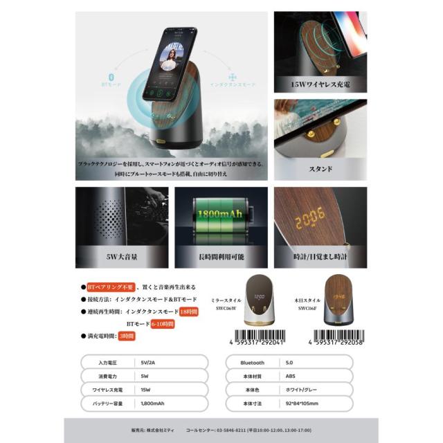 インダクタンススピーカー構造を採用スマートフォンから出る「音」の振動を増幅すさせる構造の為、Bluetoothにつながなくても音の広がりが体感できます。これ一台で多役の使用●スマホスタンドとして使用。非接触充電が可能●Bluetoothを繋いで音楽や、スマートフォンの動画が臨場感たっぷりで使用●インダクタンス構造で、Bluetoothに繋がなくても音楽や動画が楽しめます●Bluetooth接続で通話が可能。スマートフォンを使ったWEB会議や打ち合わせが可能●スマートフォンを置かなくてもデジタル時計が表示しているため、デスククロックとして使用が可能●表面がミラー仕上げの為、鏡として使用が可能●目覚まし時計 商品の仕様●入力電圧:5V/2A●消費電力:5W●ワイヤレス充電:15W●バッテリー容量:1,800mAh●接続方法:インダクタンスモード&BTモード●Bluetoothバージョン:5.0●NFA:スマートフォンを載せるだけでスピーカーから音が再生●満充電時間:3時間●連続再生時間:インダクタンスモード18時間/Bluetoothモード6-10時間●本体材質:ABS●本体色:ホワイト/木目●本体サイズ:横90mm×奥行90mm×高さ150mm●化粧箱入りのサイズ:横95mm×奥行111mm×高さ185mm×重さ428g
