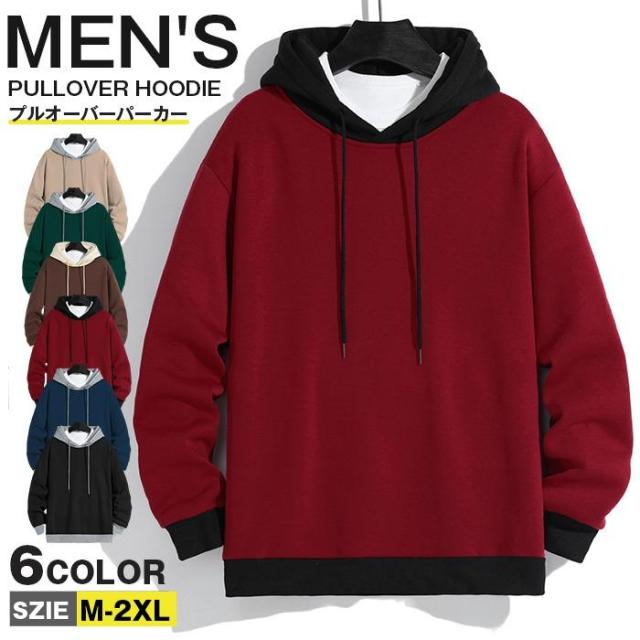 プルオーバーパーカー メンズ 長袖 パーカー プルオーバー レイヤード 重ね着 無地 トップス 春 秋 スウェットパーカー スポーツウェア フード付き キレイめ おしゃれ