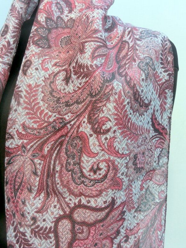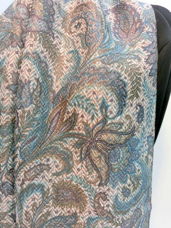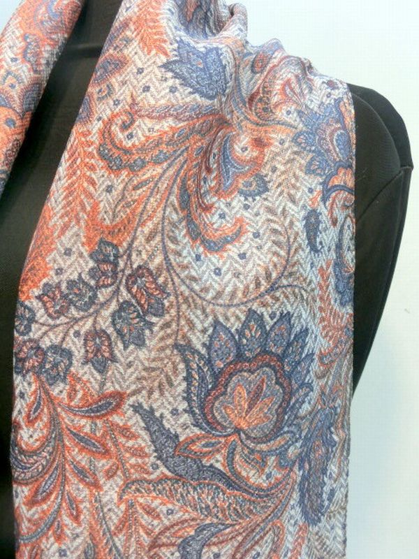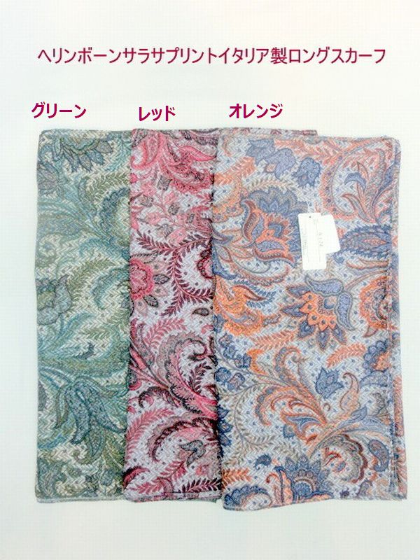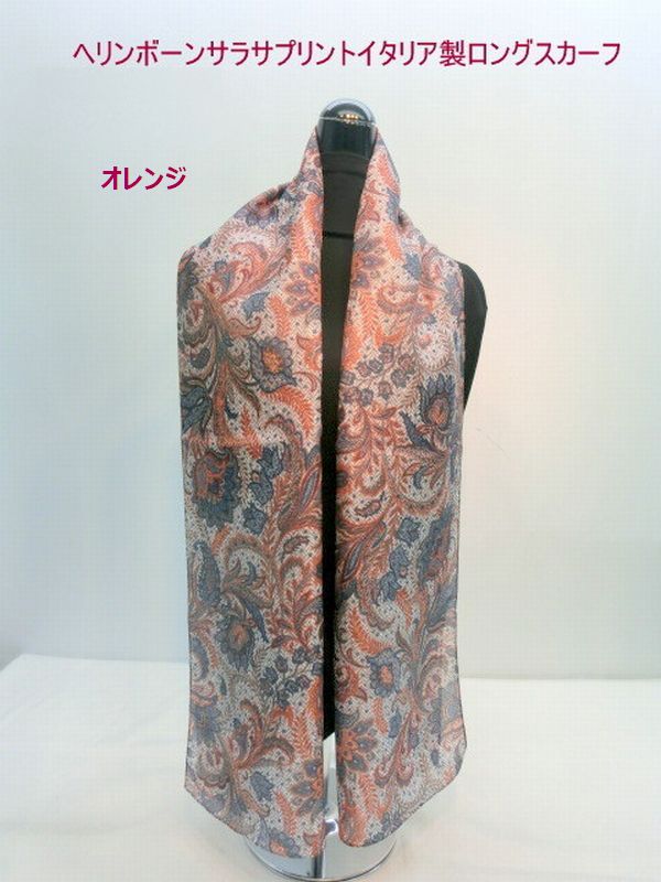 | ふんわり柔らかいポリエステルシフォン生地にヘリンボーンサラサ柄をプリントしたイタリー製ロングスカーフです。イタリー製の生地の風合いや色彩も柄もご覧いただき、秋冬の首回りのオシャレのポイントにぜひお使い下さい。 |