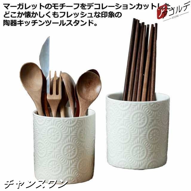 筒 キッチンツールスタンド カトラリースタンド 重厚感 円柱 陶器 花柄 カトラリー入れ キッチンツール収納 箸立て おたま おしゃれ ツールスタンド レードル フライ返し キッチンツールスタンド 入れ 菜箸 調理道具 収納 キッチン収納 かわいい 白