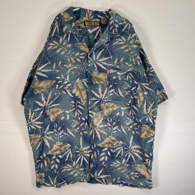 古着 NL by naturalife 半袖シャツ リネン 植物 オープンカラー XXL 水色系 総柄 メンズ