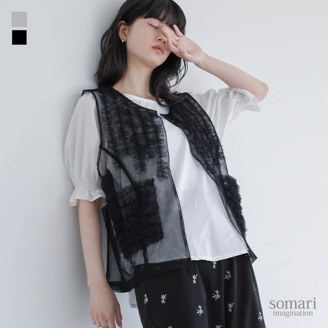 ベスト レディース トップス ジレ チュール フリル シアー 透け感 羽織 ポケット レイヤード 重ね着 春 夏 【TP】 羽織り ライトアウター チュールベスト チュールジレ ノースリーブ ショート丈 ミディ丈 ミドル丈 切り替え 無地 シースルー おうちで洗える 秋 カジュアル レトロ クラシカル シンプル ナチュラル キレカジ フェミニン ガーリー 楽ちん Sサイズ Mサイズ Lサイズ LLサイズ 3Lサイズ XLサイズ ぽっちゃり 体型カバー 大きいサイズ プラスサイズ 10代 20代 30代 40代 50代 60代 女子会 オフィス 通勤 通学 お買い物 お出掛け 旅行 リゾート レジャー おしゃれ お洒落 トレンド 流行 somari imagination ソマリイマジネーション 可愛い系 大人女子 大人可愛い お洒落可愛い 大人カジュアル 上品 きれいめ osharewalker オシャレウォーカー おしゃれうぉーかー グレー 灰色 ライトグレー ブラック 黒[ID]12on0rj