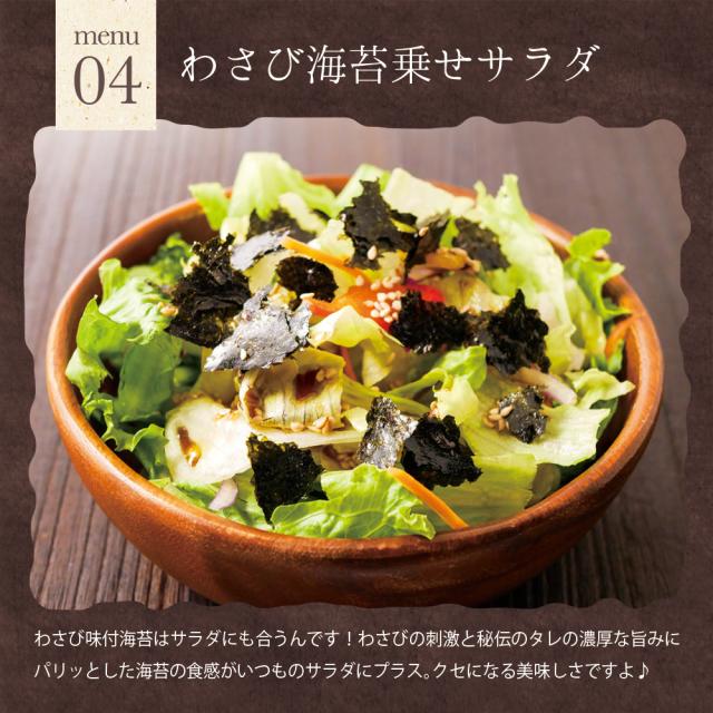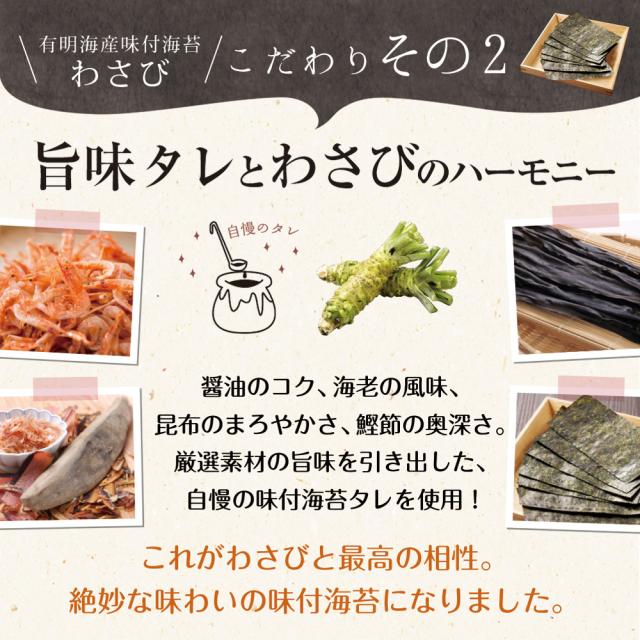- わずかに風味はするものの、わさびを感じるほどではないですね、家族全員で同じ感想でした。特にわさびに強いわけではありません。のり自体の歯切れもイマイチ。味自体は程よく落ち着いた味なので濃すぎず甘すぎずで...