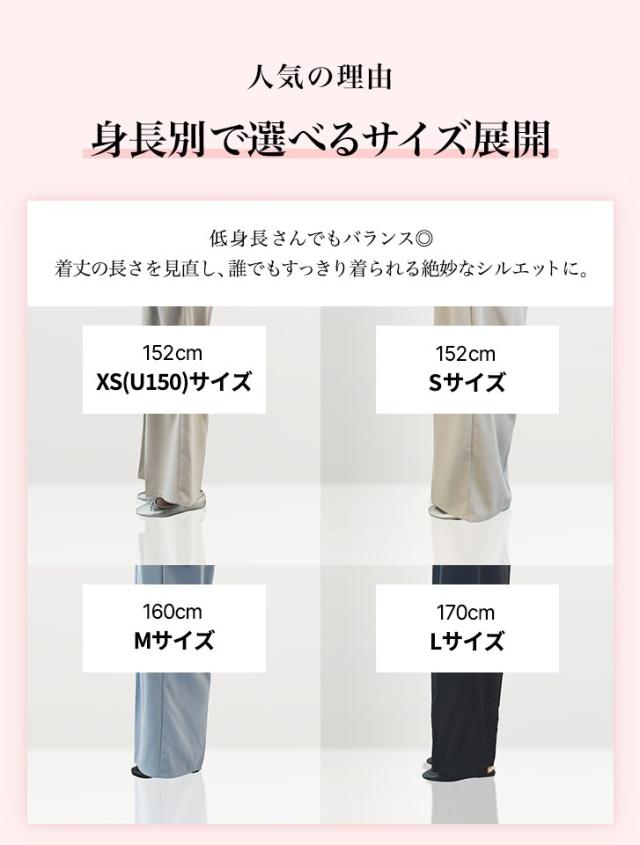 S 前ウエスト: 33cm 後ウエスト: 33〜46cm ヒップ: 118cm 股下: 58.5cm 裾周り: 66cm 総丈: 93.5cm, M 前ウエスト: 35cm 後ウエスト: 35〜48cm ヒップ: 122cm 股下: 66cm 裾周り: 68cm 総丈: 102cm, L 前ウエスト: 37cm 後ウエスト: 37〜50cm ヒップ: 126cm 股下: 69.5cm 裾周り: 70cm 総丈: 106.5cm, U150(XS) 前ウエスト: 33cm 後ウエスト: 33〜46cm ヒップ: 118cm 股下: 53cm 裾周り: 66cm 総丈: 88cm