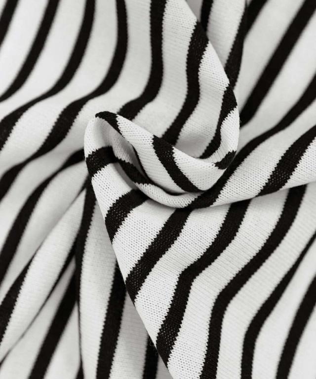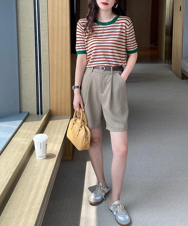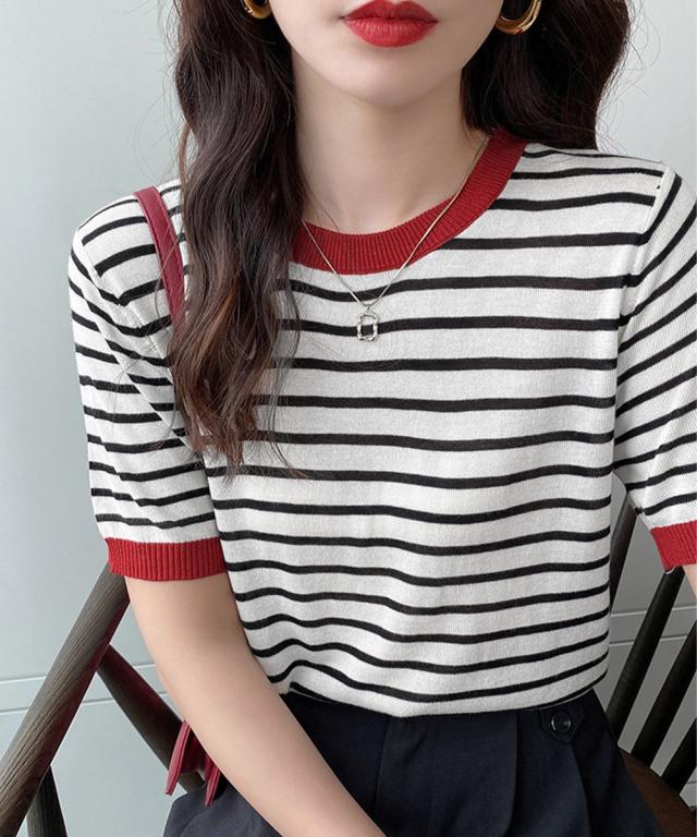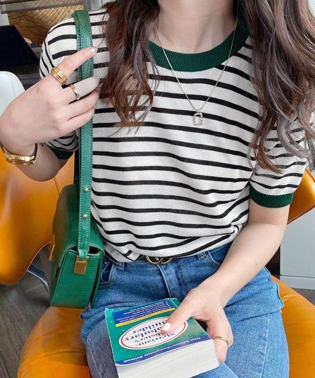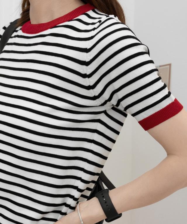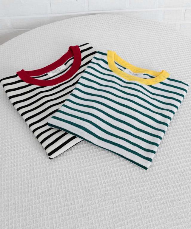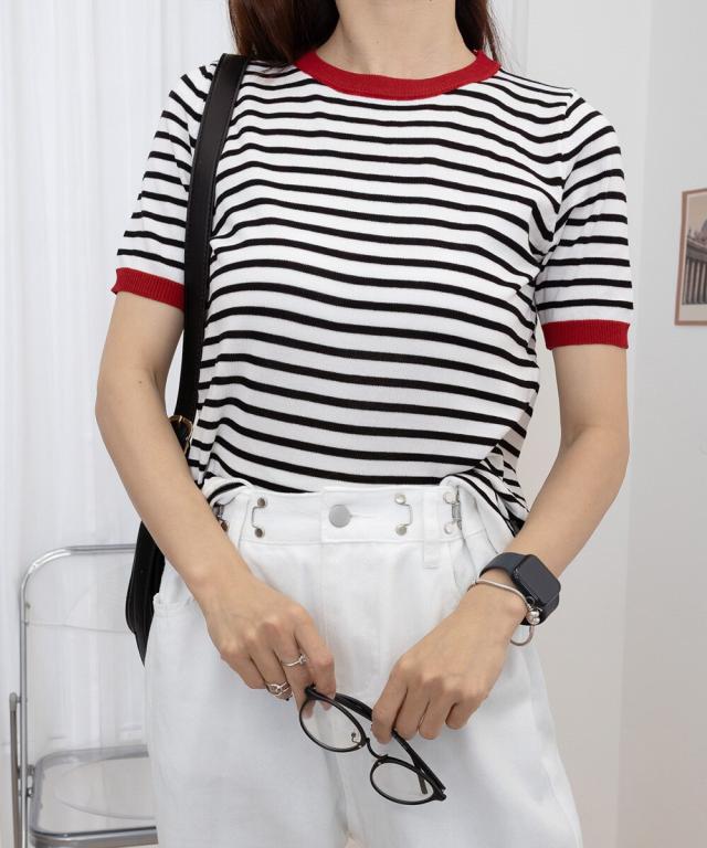 マルチボーダー×配色リブが目を惹く半袖ニットトップス。