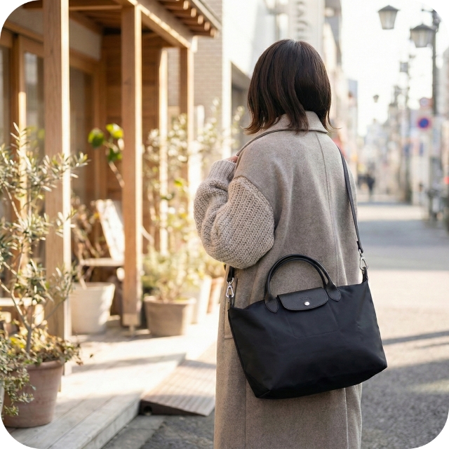| 2WAY仕様でシーンに合わせて使える 調節・取り外し可能なストラップ付きで、手持ちと肩掛けの2WAY使用が可能。シーンや服装に合わせて持ち方を変えられます。約453gの安定感ある重さで、荷物が多い日でも安心して使用できます。 |