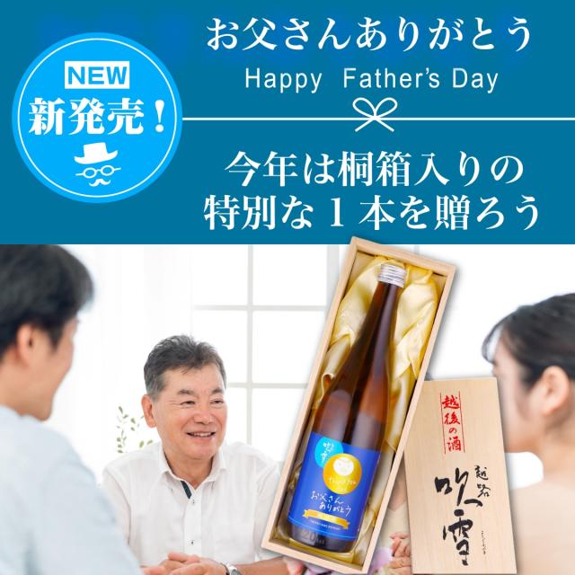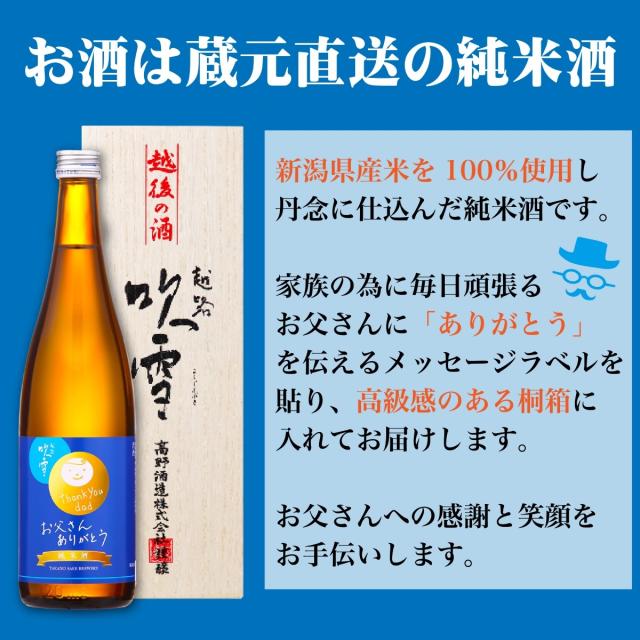新潟の蔵元、高野酒造が、新潟県産米を丁寧に仕込んだ辛口純米酒に、あなたの感謝のメッセージを添えたラベルを貼り、風格ある桐箱に入れて、蔵元から直接お届けいたします。 私たちが願うのは、お父さんの心からの笑顔。