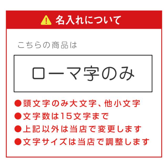 | 名入れ | プリントするお名前は「入力欄」へご記入下さい。 ローマ字のみ ※日本語不可 文字数は10文字までとさせていただきます。 ・上記以外は当店で変更します。 ・文字サイズは当店で調整します。 |