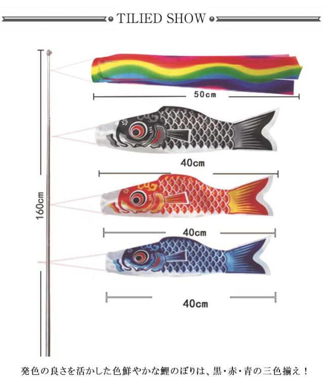 | サイズについての説明 | 5点セット内容:「吹流し50cmx1、黒鯉40cmx1、赤鯉40cmx1、青鯉40cmx1、1.6m伸縮スタンドx1」 |