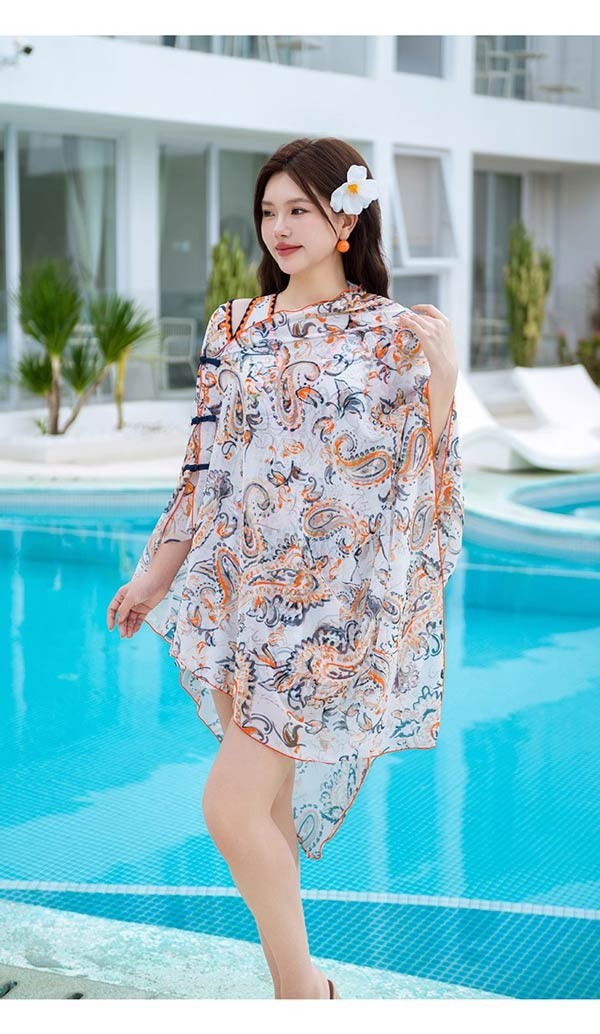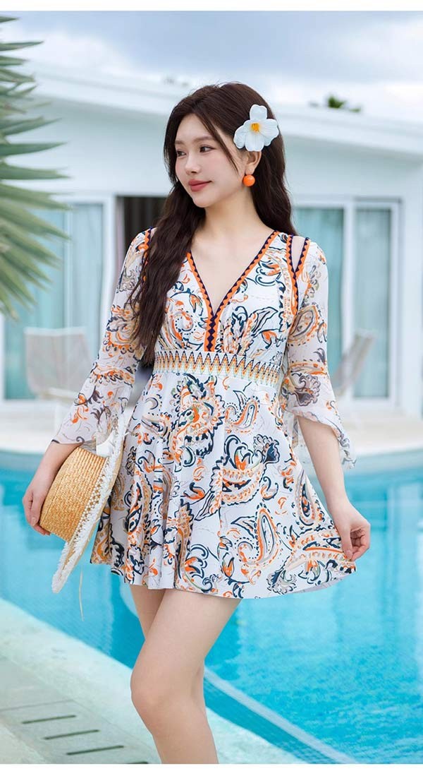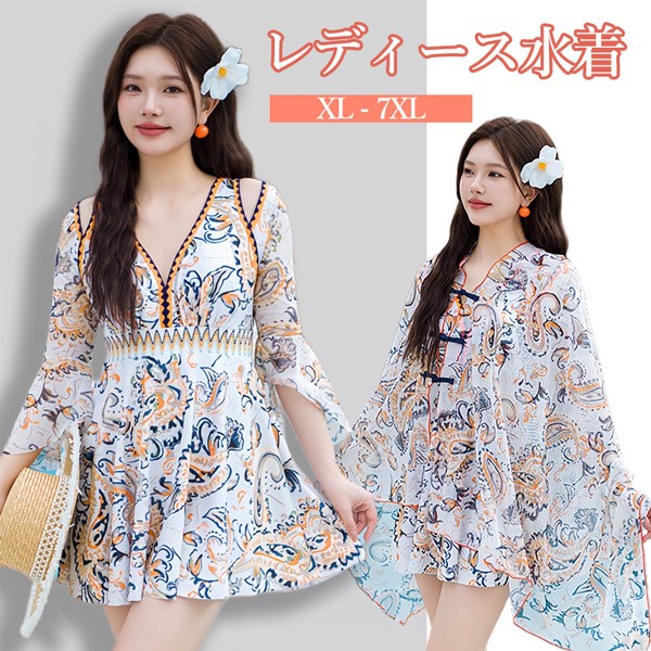ワンピース水着 エスニック Vネック 肩出し 服みたいな 水着 長袖 透け感あり パレオ付き パッド付 レディース 着痩せ レトロ風 セクシー 写真映え 撮影用 海 夏 サマー プール リゾート かわいい 旅行 温泉 大人 女性用 母の日 大きいサイズ オレンジ XL 2XL 3XL 4XL 5XL 6XL 7XL mg830m4m4x7 mg830m4