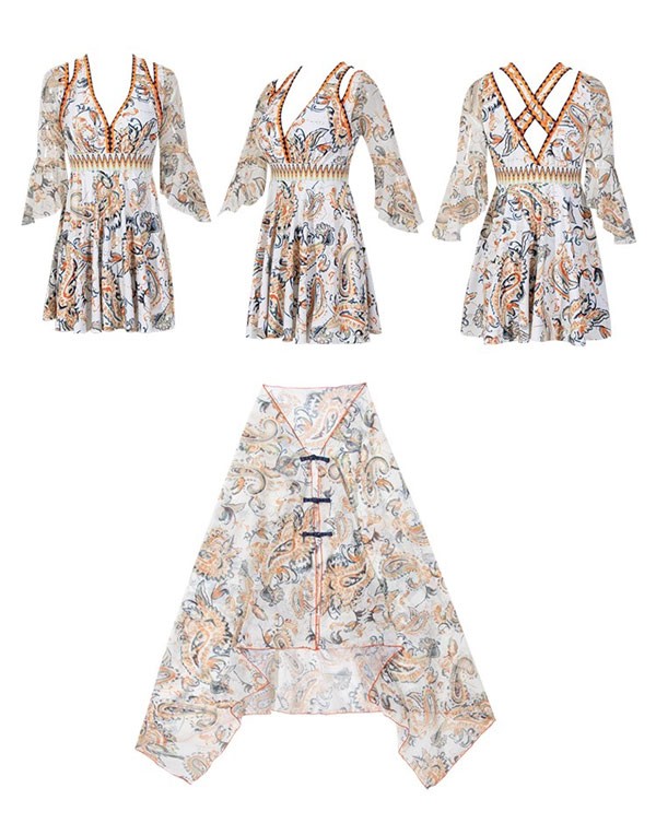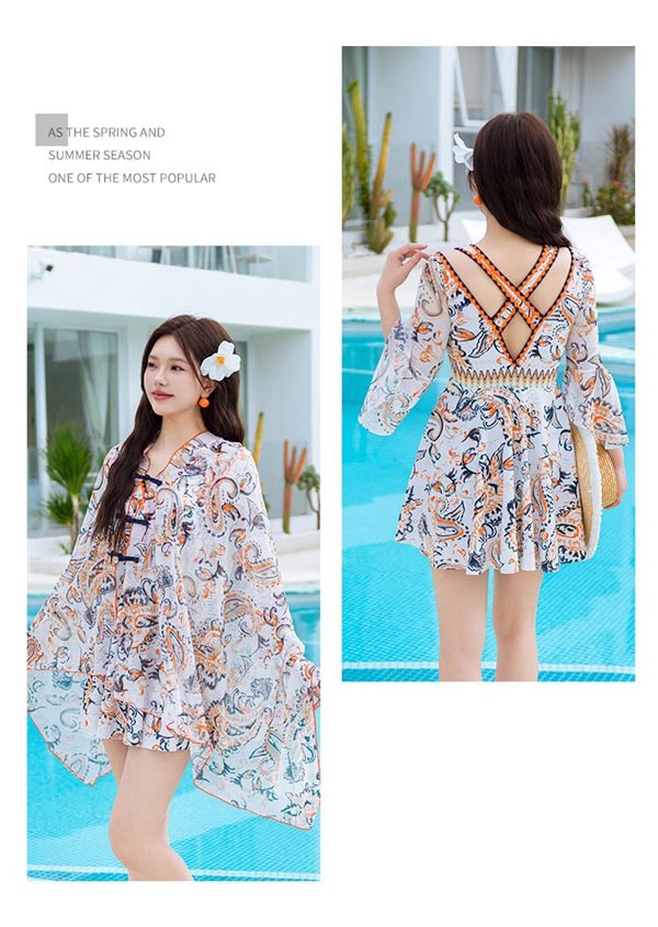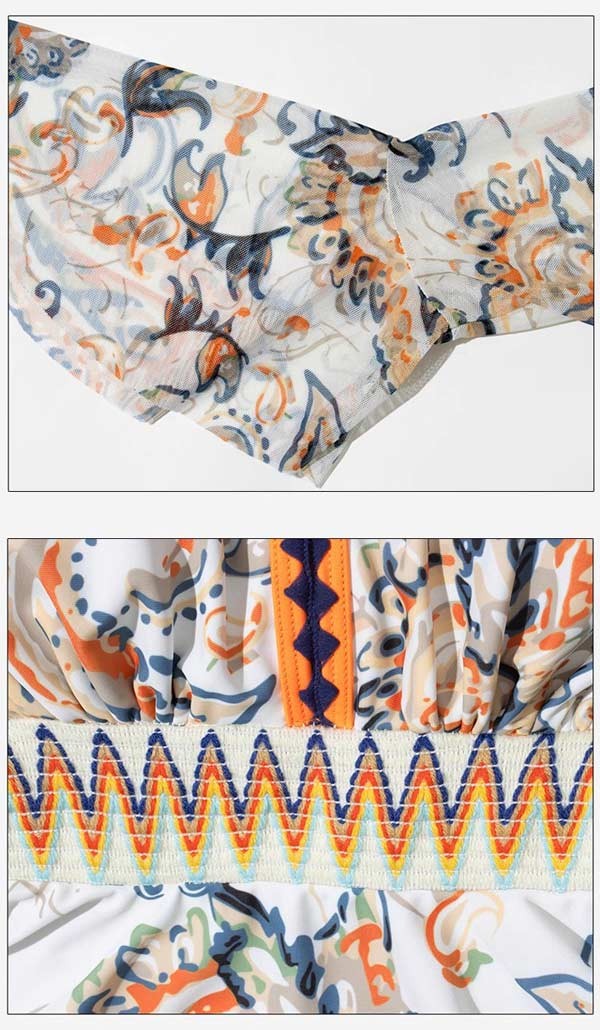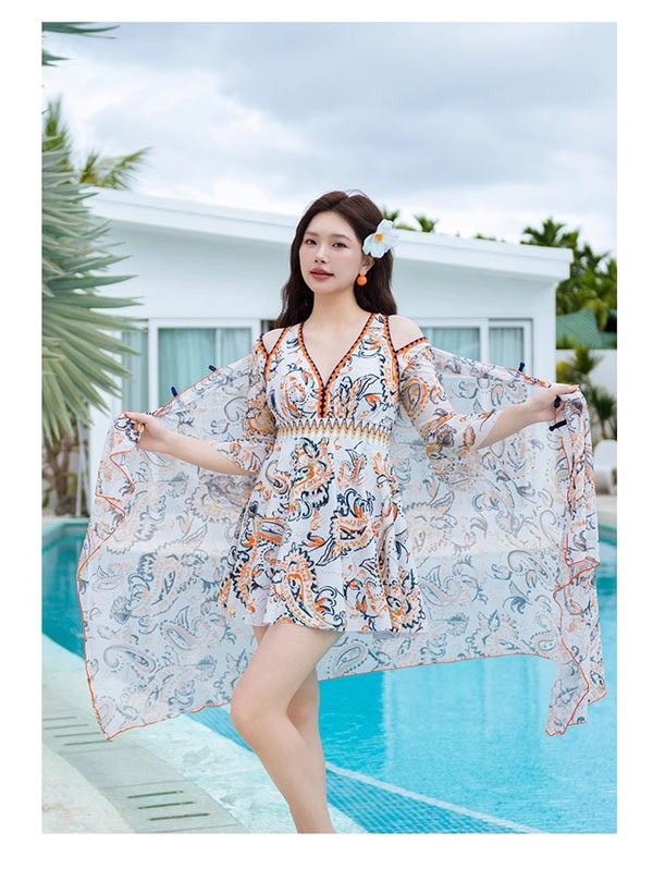 ワンピース水着 エスニック Vネック 肩出し 服みたいな 水着 長袖 透け感あり パレオ付き パッド付 レディース 着痩せ レトロ風 セクシー 写真映え 撮影用 海 夏 サマー プール リゾート かわいい 旅行 温泉 大人 母の日 大きいサイズ XL 2XL 3XL 4XL 5XL 6XL 7XL