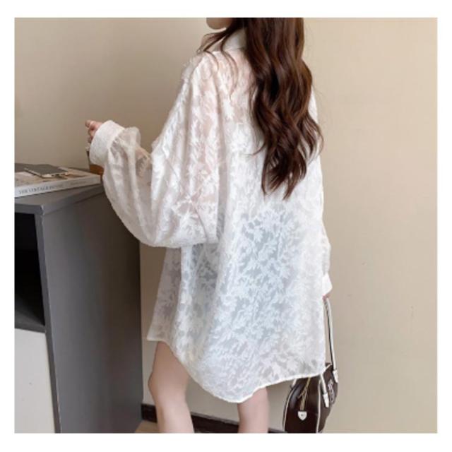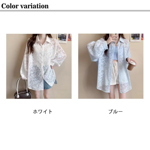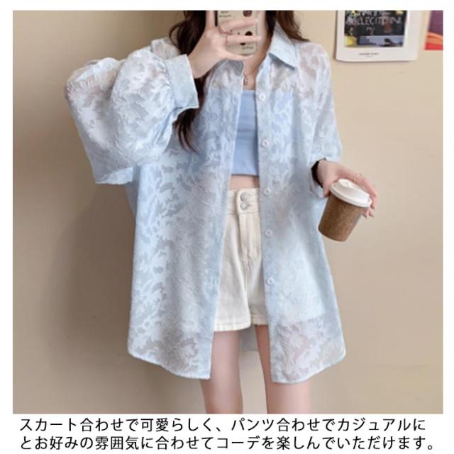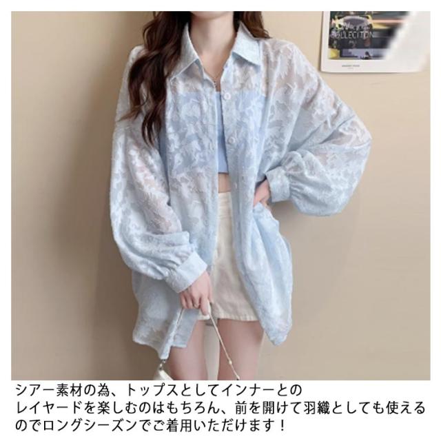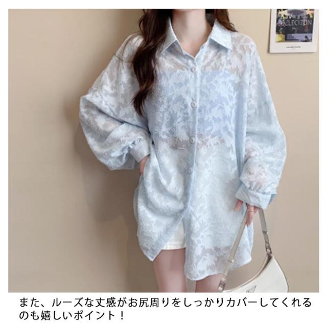 シアーシャツ レディース 長袖 シアートップス ブラウス 白 ジャガード 花柄 透け感 バルーンスリーブ シースルー シャツ オーバーサイズ ゆったり オフィスカジュアル カジュアル 韓国ファッション 送料無料