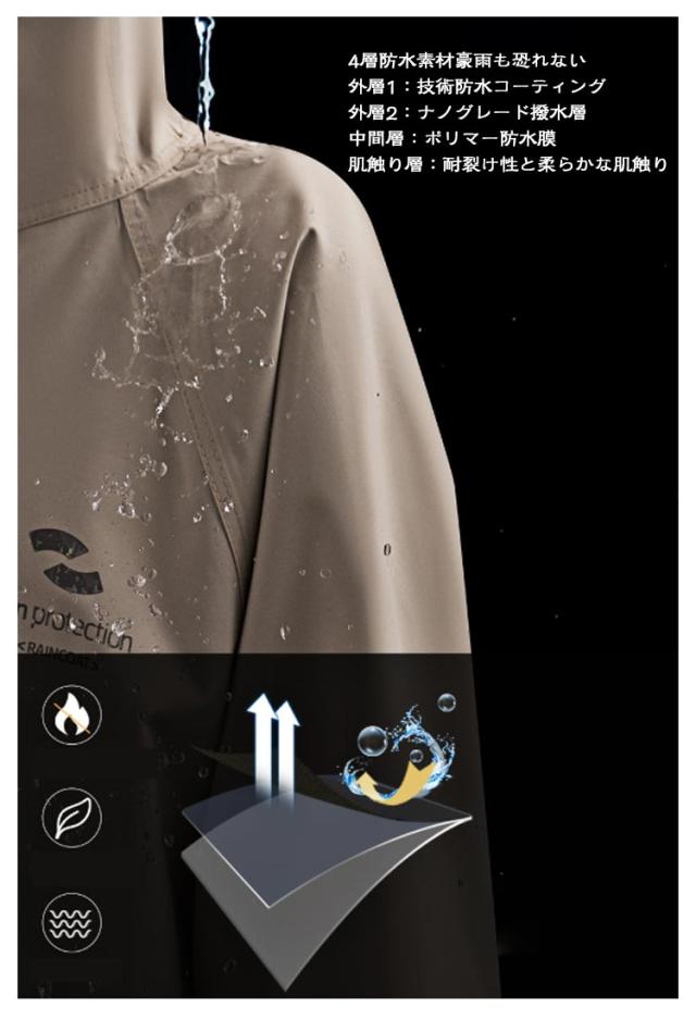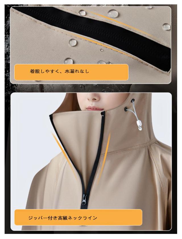 | レインコート 150-190cm 男女兼用 ★高い性能で水の侵入を防ぐ 透湿性、撥水性能抜群 ★肌に優しく 安全安心な素材 ★4層防水素材 豪雨も恐れない ジッパー付き高級ネックライン 着脱しやすく、水漏れなし スムーズなジッパー動作 1.圧着ジッパー シームレス防水 2. ジッパー襟首 着脱がさらに便利 裾を広げて伸ばし 移動は自由 バックパックもそのまま 自由な着用感 拡大されたバックパックスペース あらゆるバックパックに対応 人車分離 携帯して乗り降りする方が安全 多角度調整可能なマジックテープ 視界を妨げないデザイン 様々な髪型に合わせたつば調整 4層防水素材豪雨も恐れない 外層1:技術防水コーティング 外層2:ナノグレード撥水層 中間層:ポリマー防水膜 肌触り層:耐裂け性と柔らかな肌触り | |