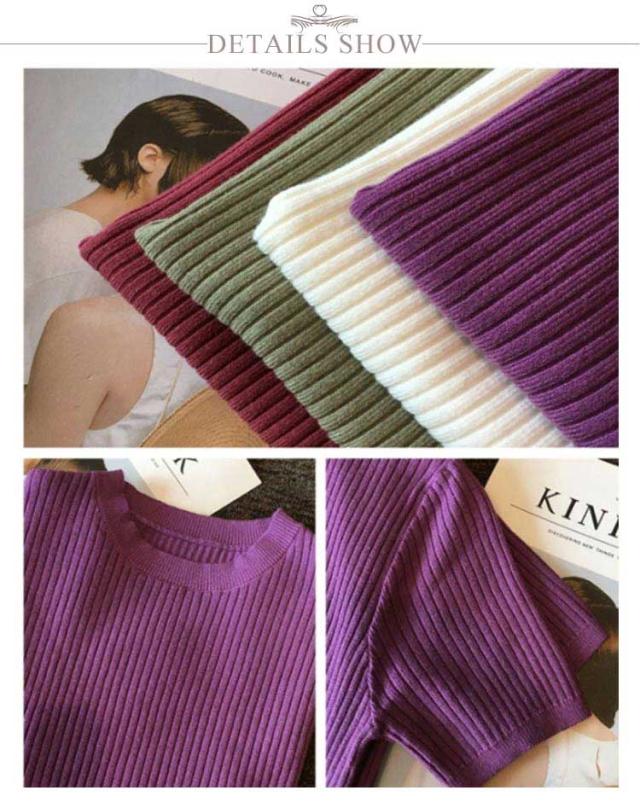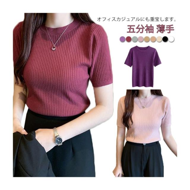 サマーニット 韓国 ストレッチ 40代 オフィス 五分袖 カジュアル トップス リブニット 薄手 シンプル ニット サマーセーター 秋 クルーネック 夏 春 レディース 通勤 おしゃれ カジュアル きれいめ 20代 30代 サマーニット 50代