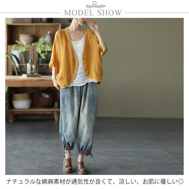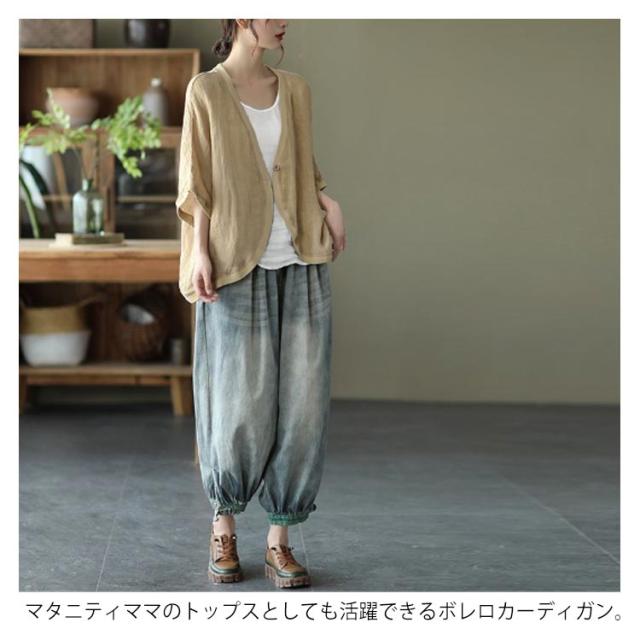 | どんなアイテムにも合わせやすいショート丈リネンカーディガン。 ナチュラルな綿麻素材が通気性が良くて、涼しい、お肌に優しい◎ 二の腕をカバーしてくれるドルマン7分袖、UV対策や冷房対策にもおススメ。 ゆったりしたリラックスなシルエット、腰周りなど気になるところをさり気なくカバーし、上下Vラインになったデザインが着痩せ効果抜群◎ 薄手の生地なので、かさばらず、バッグなどに収納しての持ち運びにも便利。 マタニティママのトップスとしても活躍できるボレロカーディガン。 | |