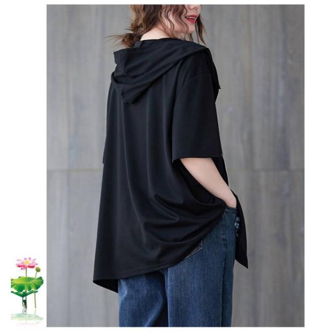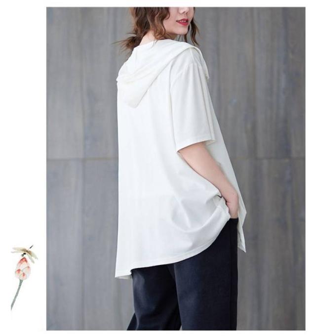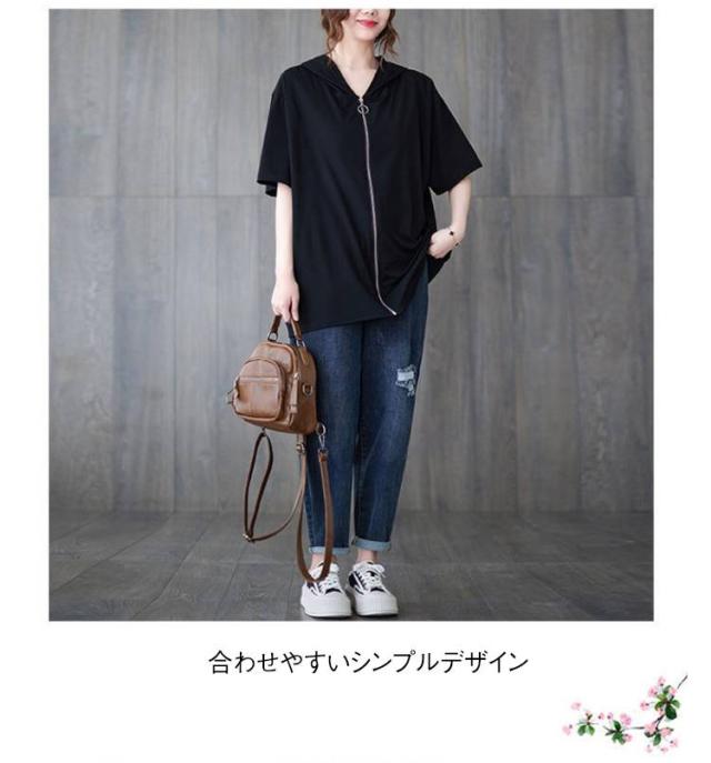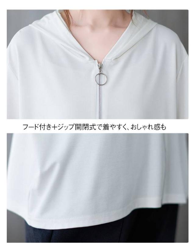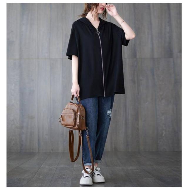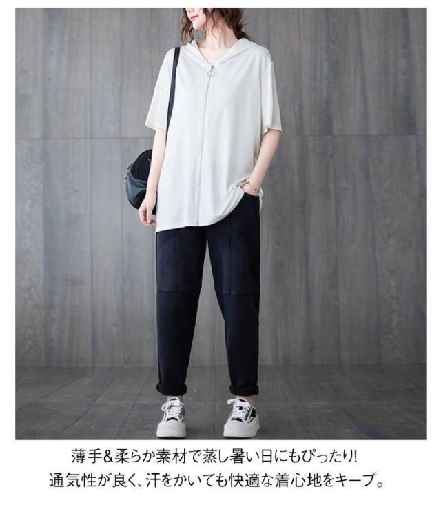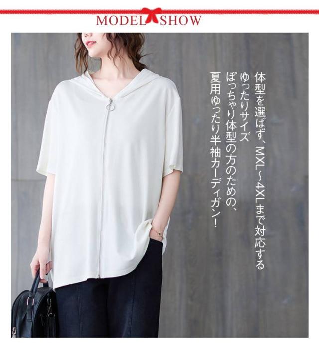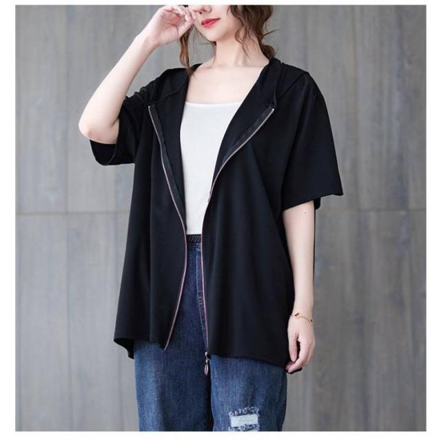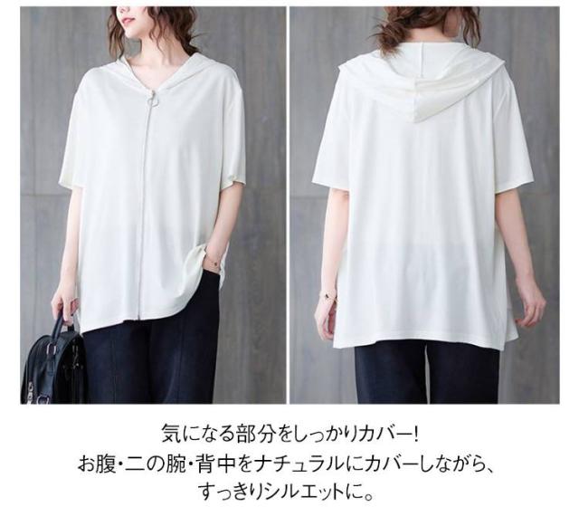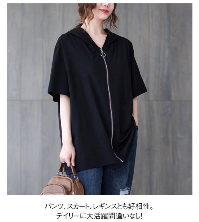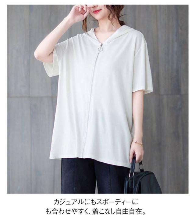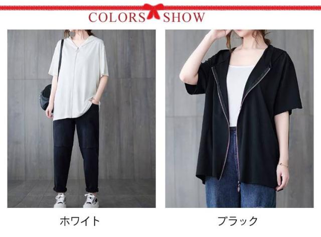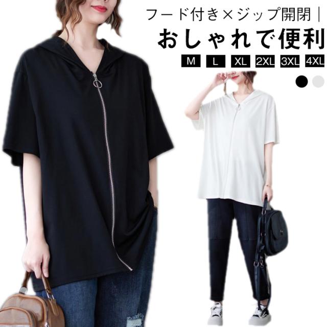 Tシャツ カーディガン 半袖 ジップアップ レディース レディース ゆったり フード付き カジュアル トップス 大きいサイズ 半袖tシャツ ビッグシルエット 体型カバー 白 黒