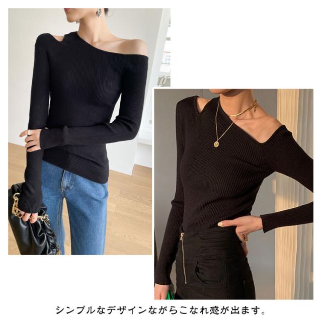 ニットトップス カジュアル ニットソー 長袖 セーター ワンショルダー トップス シンプル 細見え ワンショルダー 大人可愛い ニットプルオーバー ニット フェミニン アシンメトリー 春 秋 ブラック ブラウン