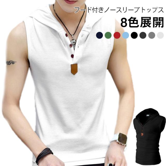 スリム メンズ Vネック タンクトップ フード付きTシャツ ノースリーブパーカー 夏用 ノースリーブtシャツ トップス ジムウェア スポーツタンク 細身 夏服 8色展開