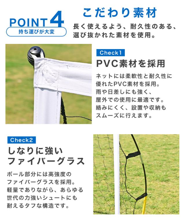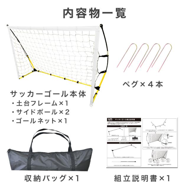 | 内容 | サッカーゴール本体 ・土台フレーム×1 ・サイドポール×2 ・ゴールネット×1 収納バッグ×1 ペグ×4 組立説明書 |