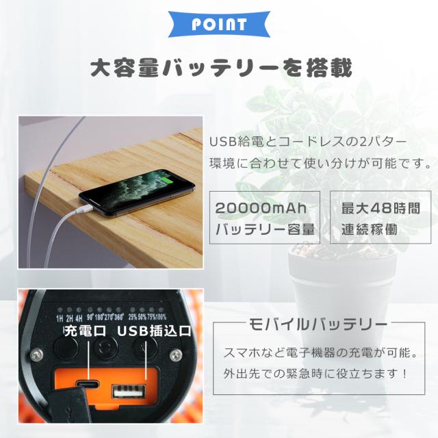 ★20000mAh大容量バッテリーが、長時間の連続使用を可能にします。モバイルバッテリー、USB—ACアダプター、パソコンなど複数の充電方法に対応。アウトドアの便利な充電器として使えますし、スマホもタブレットも充電できます。