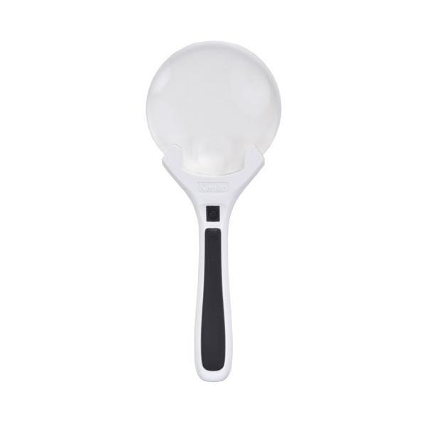 新聞、雑誌、地図などを長時間見るときにも目が疲れにくい倍率2倍。より小さな文字も見やすい3.5倍の小玉レンズも付いて、さらに拡大して見たいときに便利です。白と黒のツートンカラーとフチなしレンズでスタイリッシュなデザインも魅力。持ち手の黒ライン部は、滑りにくい素材を使用し、持ちやすくなるよう工夫をしています。