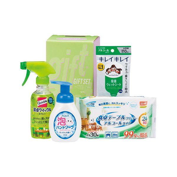 内容 : 花王食卓クイックルスプレー(約300ml)・アクア泡ハンドソープ(約250ml)・ライオンキレイキレイお手ふきウエットシート(アルコールタイプ)(10枚入)・クリンクル食卓テーブルふきん(30枚入)×各1