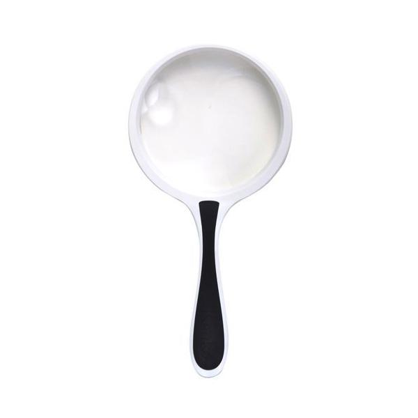 レンズ径100mm、手持ちルーペ最大サイズで広い範囲が見えやすい。白と黒のツートンカラーでシンプルデザインの手持ちルーペです。 新聞、雑誌、地図などを長時間見るときにも目が疲れにくい倍率2倍。より小さな文字も見やすい3.5倍の小玉レンズも付いて、さらに拡大して見たいときに便利です。滑りにくい素材を使用した持ちやすい持ち手もポイントです。