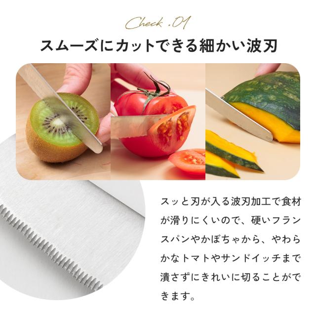 ※ご注意:こちらのナイフは、パンやトマトにはスッと切れる波刃タイプとなります。果物の皮をむいたり、薄くそいだりする作業には向かない構造ですので、用途に合わせてご使用ください。