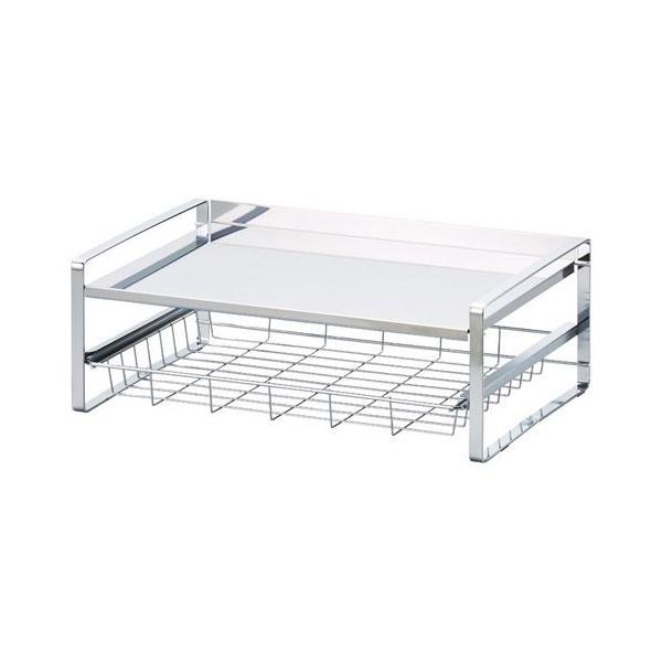 スライド引出しがついたトースターラック。カゴにもなるスライド引出し。キッチンでよく使うラップやミトンなどの収納にピッタリ。スライド引出しには金属音防止の樹脂レール付き。スベリ止めゴム付。