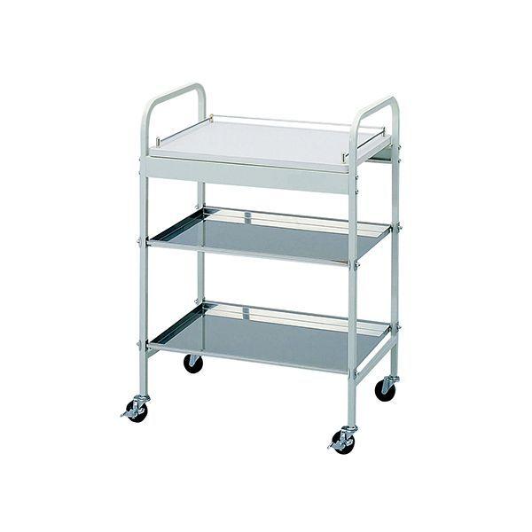 天板はユニット実験台、中段・下段は薬品や小物のトレーとして利用できます(転落防止枠付き)。