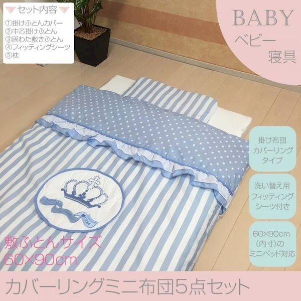 内寸60×90cmのミニベットにぴったりサイズのミニ布団セット。場所をとらないミニサイズなのでふいのお昼寝にも最適。掛けふとんはカバーリングタイプ、フィッティングシーツも入ってるからお洗濯できて衛生的!あかちゃんのおねんねに必要なものだけを入れたシンプルセット。セット内容掛けふとんカバー掛けふとん固わた敷きふとんフィッテ