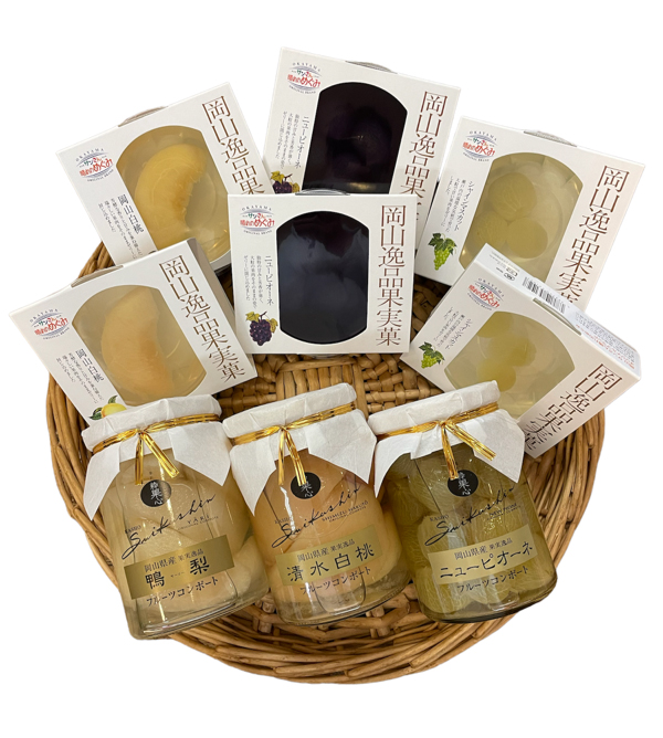 岡山特産フルーツをさっぱりとしたシロップに漬け込んだフルーツコンポートと岡山特産の白桃、ニューピオーネ、シャインマスカットのコンポートが入ったフルーツゼリーです。